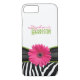 You can personalise the name on this chic black, white, pink, and green zebra print and gerbera daisy customisable iPhone case. Fun and cheerful featuring a black and white zebra print design and a pretty hot pink gerber daisy flower. This girly design makes a great gift for her. To personalise the name, use the personalise tools. For more extensive changes (font, font colour, font size, text placement), use "customise it".