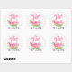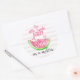 Cute pink watercolor one is a melon birthday favor sticker featuring a large watermelon slice and some decorative watercolor text on a white and pink striped background.