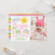 Cute sunshine themed first birthday invitation featuring a cute sun, two rainbows, a cloud and some handwritten style text . This our little ray of sunshine first birthday invitation is a cute way to invite guests to a colorful sunshine themed first birthday party.