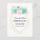 Wedding save the date postcard with a pretty pastel watercolor succulents bouquet. These succulent flowers, leaves and sprigs are a soft pink and green. A trendy geometric frame with a faux gold foil border.