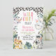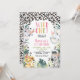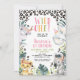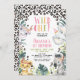 Cute girls wild one themed first birthday invitation featuring four jungle animals, foliage and cheetah print pattern. This wild one birthday invitation also features a pastel colored heading and tribal head pieces.