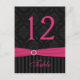 This dramatic hot pink, dark charcoal grey and black damask with a striped pattern wedding table number postcard has a PRINTED hot pink ribbon with a PRINTED diamond jewels buckle on it that matches the wedding invitation shown below. ****PLEASE NOTE that you MUST change the number 12 to each of the numbers that you need, add it to your cart, and then return and repeat the process until you have all the individual numbers you need. Quantity discounts will apply as you add cards to your cart. ***PLEASE NOTE that if you change the font or size of the font, it may alter how your card prints. It will print the way you see it on your monitor, so if you have alignment issues, or sizing problems, please contact me for help. I will not see your card once you order it, and Zazzle will NOT edit anything (typos, alignment, etc.). If you require assistance or would like any other matching items, please email your request to niteowlstudio@gmail.com.