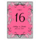 Hot Pink Grey Black Swirls Wedding Table Number Card with elegant script font. BlissfulWedding © at Zazzle. Personalise with bride and groom names and wedding date. You can change the background colour using the edit menu.