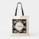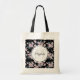 A tote bag with an elegant pattern made with a watercolor illustration of pink flowers with blue-grey leaves and stems. Elegant black background.