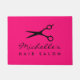 Custom hot pink hair salon door mat with barber scissors silhouette outline logo. Elegant black and white entry rug for hair stylist, hairdresser, store, barber shop, beauty salon, spa business, beautician etc. Add your own professional company name or quote. Classy modern script typography template.