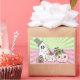 Cute whimsical yellow and pink ghost and pumpkins with sunflowers spelling Boo.