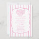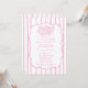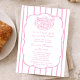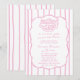 Designed in a soft pink and white color palette, this invitation features delicate vertical stripes, a gently scalloped frame, and an adorable hand-drawn bread basket illustration that brings the beloved bun in the oven theme to life. The combination of elegant script calligraphy and clean serif typography creates a romantic yet refined look—ideal for celebrating a baby girl in a cozy, welcoming way.