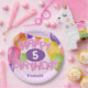 These fun and colourful birthday party paper plates feature the message, "Happy Birthday" spelled out in whimsically arranged realistic pink frosted cutout cookies surrounded by multicolor balloons and bunting flags - child's age and name can be personalised - background is a pattern of small white polka dots on pale pink - by katz_d_zynes
