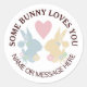 This design features silhouettes of bunnies (blue & yellow) and a pink heart. The simple animal design with personalised text makes cute modern and unique round stickers - SOME BUNNY LOVES YOU.