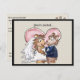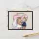 Here's a cute cartoon bride and groom beginning their first wedding dance in front of a pink heart you can make into your own wedding save the date cards. Personalise all design elements.