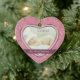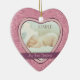 This holiday keepsake ornament features your own baby photograph framed in a pretty pink heart frame lined in silver. The heart frame is bordered with a matching rose pink floral swirl pattern. A darker plum purple banner holds your customised text; make it say whatever you'd like! The back of the ornament has the same pink floral swirl pattern border and heart shaped frame with additional text on the plum inside. This makes a nice keepsake gift for new parents.