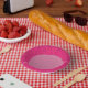 Sweet romantic design with numerous handdrawn small pink hearts floating all over the plate. By default the background is pink, but you can replace it with any colour of your choice. A semi transparent round layer covers the main area of the plate, to make the food area look cleaner, but this can be turned on/off as you like.
