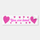 Pink hearts, two larger ones on the ends, and nine smaller ones above and below the text, You are loved, are printed on bumper stickers. The text is also pink and the background is white. Thank you for shopping at PositiveAffirmation on Zazzle.