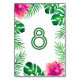 Watercolor pink hibiscus flower with monstera leaf and palm frond on white. Choose your own background colour and change the text. Repeat for all numbers of your reception wedding tables. Contact shopkeeper if you need assistance.
