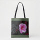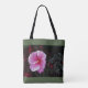 Dominating this canvas is a deep pink hibiscus, presented with such passion and precision that it appears to be more than mere fabric; it's a living, breathing piece of art. The hibiscus blooms in a symphony of deep pink shades, its petals unfurling elegantly to reveal heart-stopping details reminiscent of a master painter's brushstrokes. The colours blend seamlessly, with each hue of pink deepening into the next, contrasted against the tote's leaf-green background in a way that makes the flower leap to the eye.