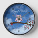 "Happy Holidays" festive design with cute pink owl on a tree branch.