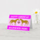 Cute pink horse birthady card, features two horses greeting in gold, with pink accents and a pink love heart. This cute horse birthday card can be personalised, add a name and custom message to the front and inside.