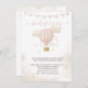 Cute baby shower invitation features pink hot air balloon with clouds.