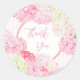Beautiful pink hydrangeas on a pink and white background. Pink coordinating double frame adds to the elegance of this thank you sticker. A perfect welcome thank you for all your guests.