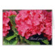 The original photograph by MaeFlowers on this Greeting Card is a closeup of pink hydrangeas and their jagged edged spring green leaves. The central pompom of flower petals almost fills the design, surrounded by the green leaves and bits of other flower pompoms on each side . The text in light pink in the dark area at the lower right says Thank you!, and this is repeated on the inside of the card in black. All text can be changed or deleted to suit your needs. Matching envelope available.