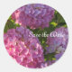 Beautiful pink hydrangeas with the sun shining down on them accent this save the date sticker for your special day!