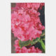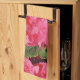 The original photograph by MaeFlowers on this Kitchen towel is a closeup of pink hydrangeas and their jagged edged spring green leaves. The central pompom of flower petals almost fills the photo, surrounded by the green leaves and bits of other flower pompoms on each side.