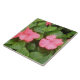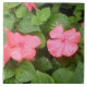 This awesome tile features a photograph of two pretty pink impatiens flowers and the surrounding foliage. The petals shine and the leaves are wet from a rainstorm.