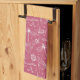 This nature kitchen towel features an array of hand-drawn creatures including butterflies, bees, ladybugs, grasshoppers, dragonflies, caterpillars, worms and flies with the hand-written text "love bug" scattered about. Illustrated in white against a pink background.