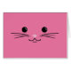 A cute pink magenta colour kitty cat animal face with a smile, whiskers, light pink nose, and shiny black eyes. An original digital art design.