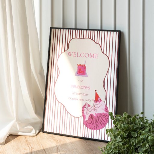 Celebrate a purr-fect first birthday with this adorable cat-themed napkins, featuring a sleepy pink kitty in a party hat, a tiny birthday cake, and a sweet striped background with a vintage-style frame. The soft pink palette and playful wording make it extra charming for a little one’s big milestone.