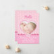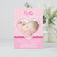 Pink heart with white lace and hearts on the background. Customise and personalise this birth announcement for your newborn with your photo and text.