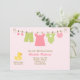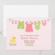 This cute Baby Shower invitation features a cute rubber duck and pink and green baby clothes, socks and bib on a laundry clothesline. This modern and elegant shower invitation is perfect for any mum to be.