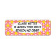 These return address labels have a geometric design of repeating pink and orange triangles with yellow circles on top on a field of off-white. Want the same design in different colours? Message me.