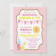Pink lemonade birthday party invitation with cute pink and yellow banner with sunshine and lemonade glasses with straws on a pink and gold dot background. This lemonade birthday invitation is easily customised for your event by simply adding your details. This is a printed design with no real glitter, etc.
