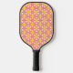 This pickleball paddle has a geometric design of repeating pink and orange triangles with yellow circles on top on a field of off-white. Want the same design in different colours? Message me.