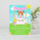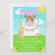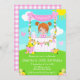 This cute and whimsical invitation features a red hair girl with fair skin at a pink lemonade stand which is decorated with flowers and bunting. In the background is a blue sky, sunshine and butterflies. The text combines decorative and sans serif fonts for a stylish and modern look. This is perfect for a summer birthday party.
