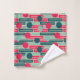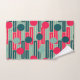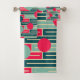 This towel set has a mid-century modern design of repeating rectangles in pink, teal, and blue with circles layered on top.
