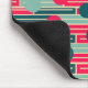 This mouse pad has a mid-century modern design of repeating rectangles in pink, teal, and blue with circles layered on top.