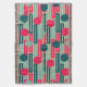 This throw blanket has a mid-century modern design of repeating rectangles in pink, teal, and blue with circles layered on top.