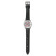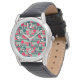 This men's watch has a mid-century modern design of repeating rectangles in pink, teal, and blue with circles layered on top.