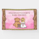 Pink girl's baby shower country and western style lil' cartoon cowgirl sitting next to her teddy bear and sunflowers welcome banner.