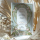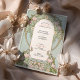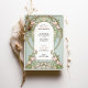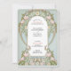 This graceful wedding invitation showcases soft pink lilies, delicate white blossoms, and pastel foliage woven into an ornate Art Nouveau frame. The floral design wraps around the central text in a refined arch, beautifully set against a soft sage green background. Inspired by the decorative elegance of the early 20th century, the intricate border details and monogrammed back design evoke a sense of timeless romance. Perfect for spring weddings, garden ceremonies, or lovers of floral vintage aesthetics. Personalise this invitation for a wedding celebration that blooms with artistic charm.