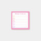 This simple pink to do list sticky notepad can be personalised with a name for a thoughtful gift. It is a small square 3x3 sticky notepad with shades of pink text and lines on a white background with an pink border. You can change the text that says "To Do List" to some other type of list if you wish. There are check boxes next to each line that can be ticked as each task is completed.