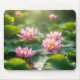 Pink lotus flowers gracefully float on a calm pond surrounded by lush green leaves, under a gentle, warm light