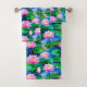 Towel set in a pattern of blooming pink lotus flowers and lush green lily pads floating on a richly textured, blue-toned water surface, in jewel-toned shades of pink and emerald green