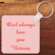 This cute keychain features a cute cartoon of a pink owl with sleepy eyes, a small beak and cute little feet. The owl has a big red love heart in the middle of its belly and wings wide open ready to give someone a big hug. There is custom text on the back so you can include a name and message of your choice. The default message reads Owl always love you.
