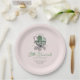 These elegant soft pink and green "Lucky Little Shamrock" gender neutral baby shower paper plates feature a chic hand-drawn Irish Victorian baby carriage with adorned with a shamrock and soft green tones, all against a soft blush pink background. Personalise with event details. Ideal for March baby showers, welcoming an Irish baby girl or a celebration around St. Patrick's Day!