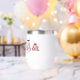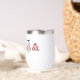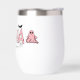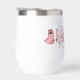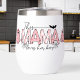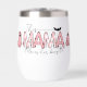 This Halloween-themed thermal wine tumbler features a delightful pale pink, white, and black design. The word “MAMA” is creatively composed of letters adorned with cute Halloween patterns: the M letters are pink with a white ghost pattern, while the A letters are pink with a dark pink bat pattern. Flanking the word “MAMA” are two charming pink ghosts, both sporting the same dark pink bat pattern. The ghost on the left adds an extra touch of whimsy with a pink bow. The playful phrase “This Mama loves her boos” is written in a trendy black script font, making a fun pun that adds to the tumbler’s charm.