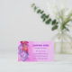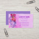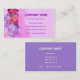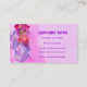 A pretty business card with a semi-abstract floral design in shades of pink, blue and mauve on a pink background, with purple lettering. The reverse is violet with white lettering. Ready for you to customise with your own details.