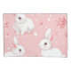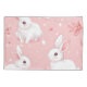 Adorable bunnies play around blooming flowers on a soft pink background.